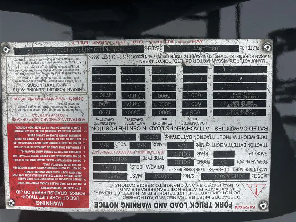 One of Nissan best models of forklift, this fantastic 3.0T LPG EFI forklift with a new paint job, new battery, new tyres, side shift with fork positioning 1070MM to 1530MM forks of your choice, dual front wheels with 1500MM wide carriage, factory lighting with factory roof. Extremely clean unit with a fully refurbished transmission, a K25 full injection Nissan engine, upsweep exhaust. This fork can be used in a range of businesses from factory to warehouse, timber yards and farms. First to see and drive will buy.